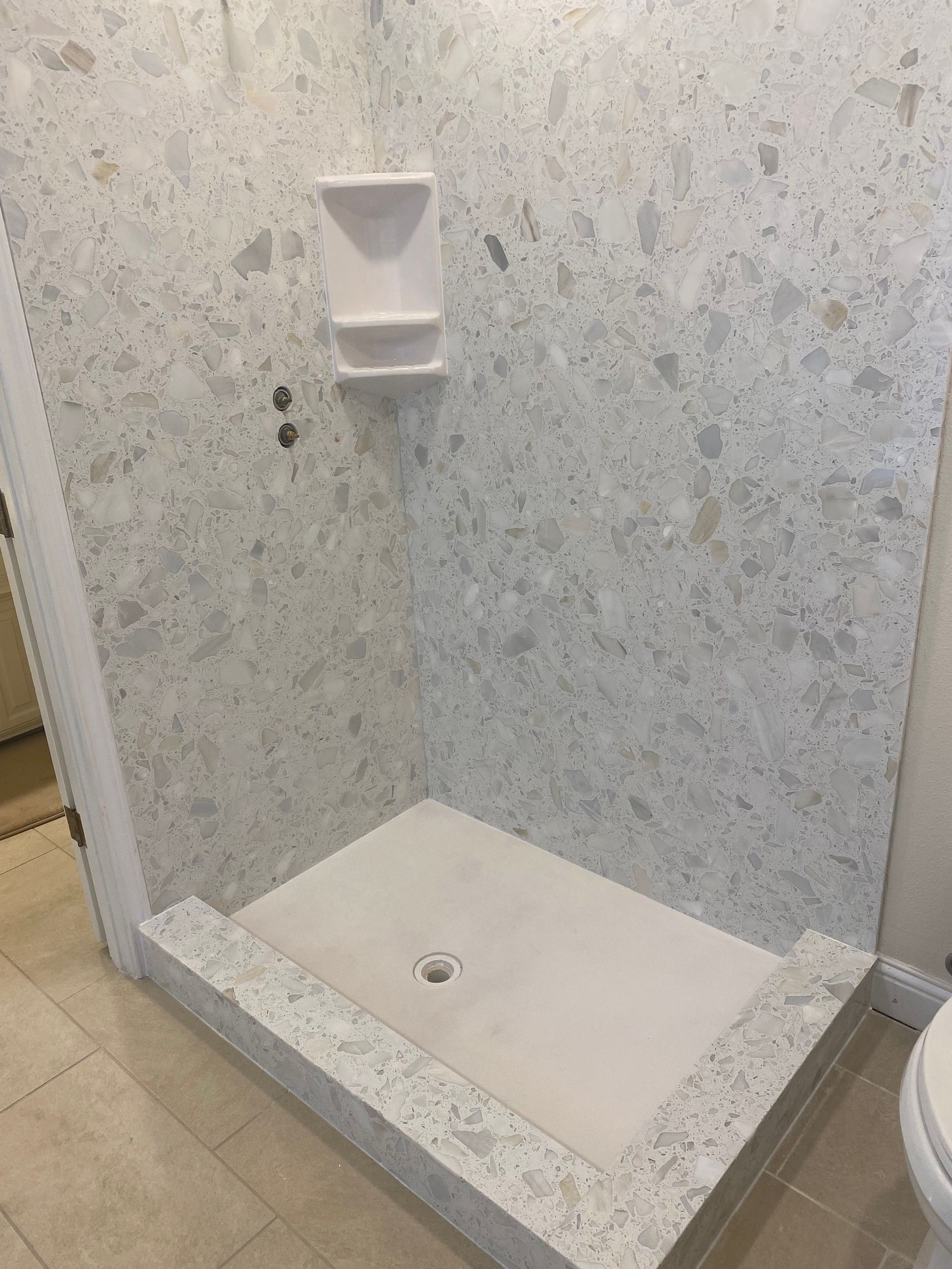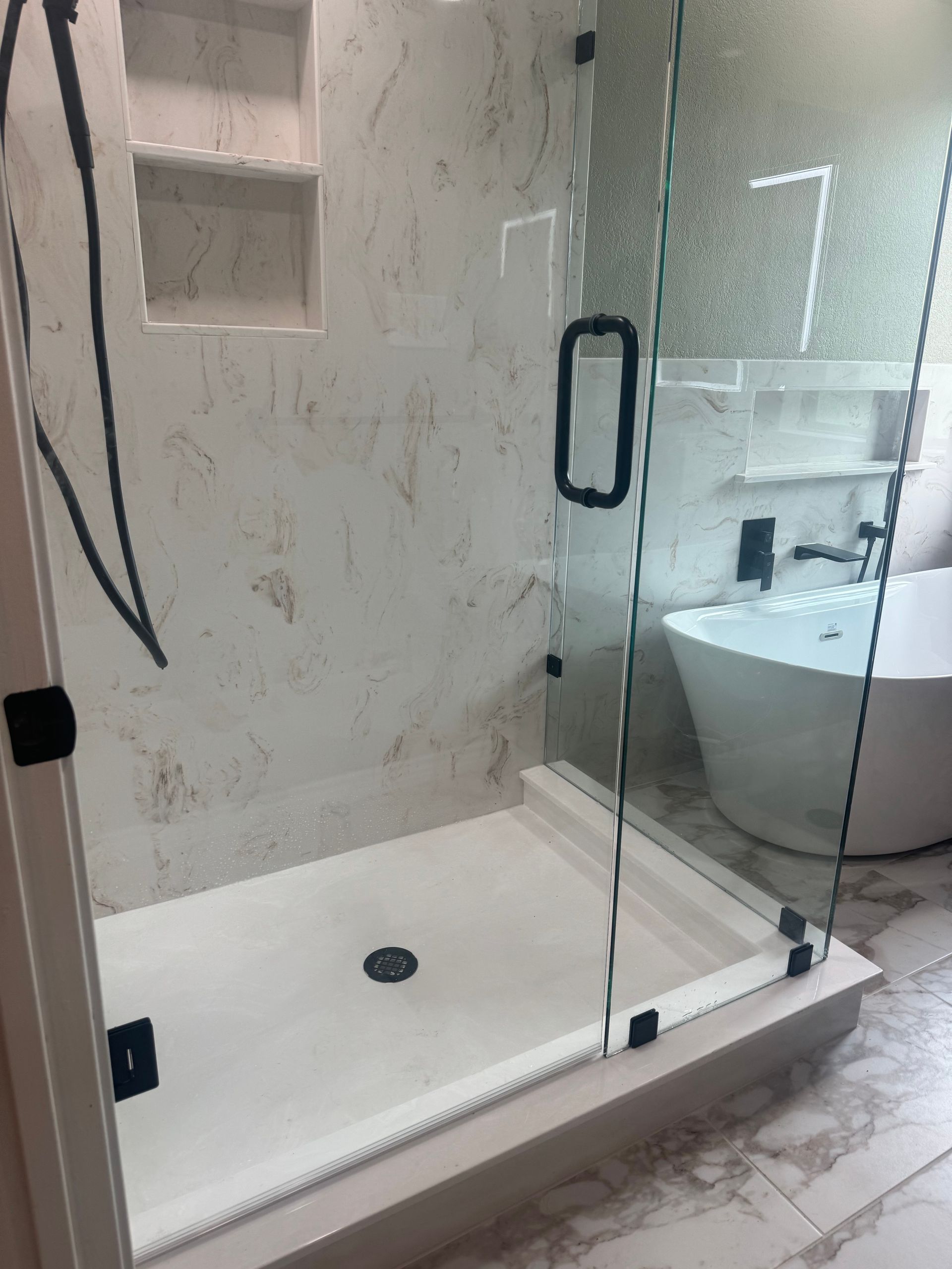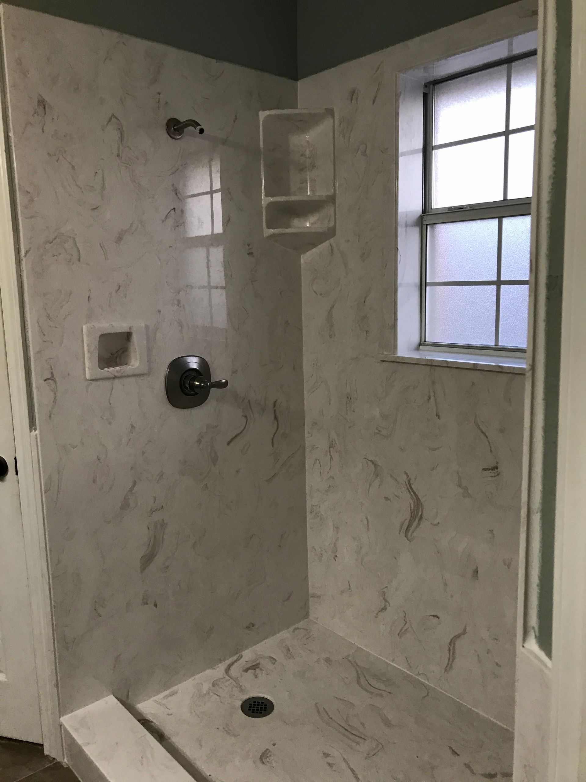 Cultured marble is a blend of natural marble dust and resins, molded into seamless shower and bathtub surfaces that resist stains and cracks.